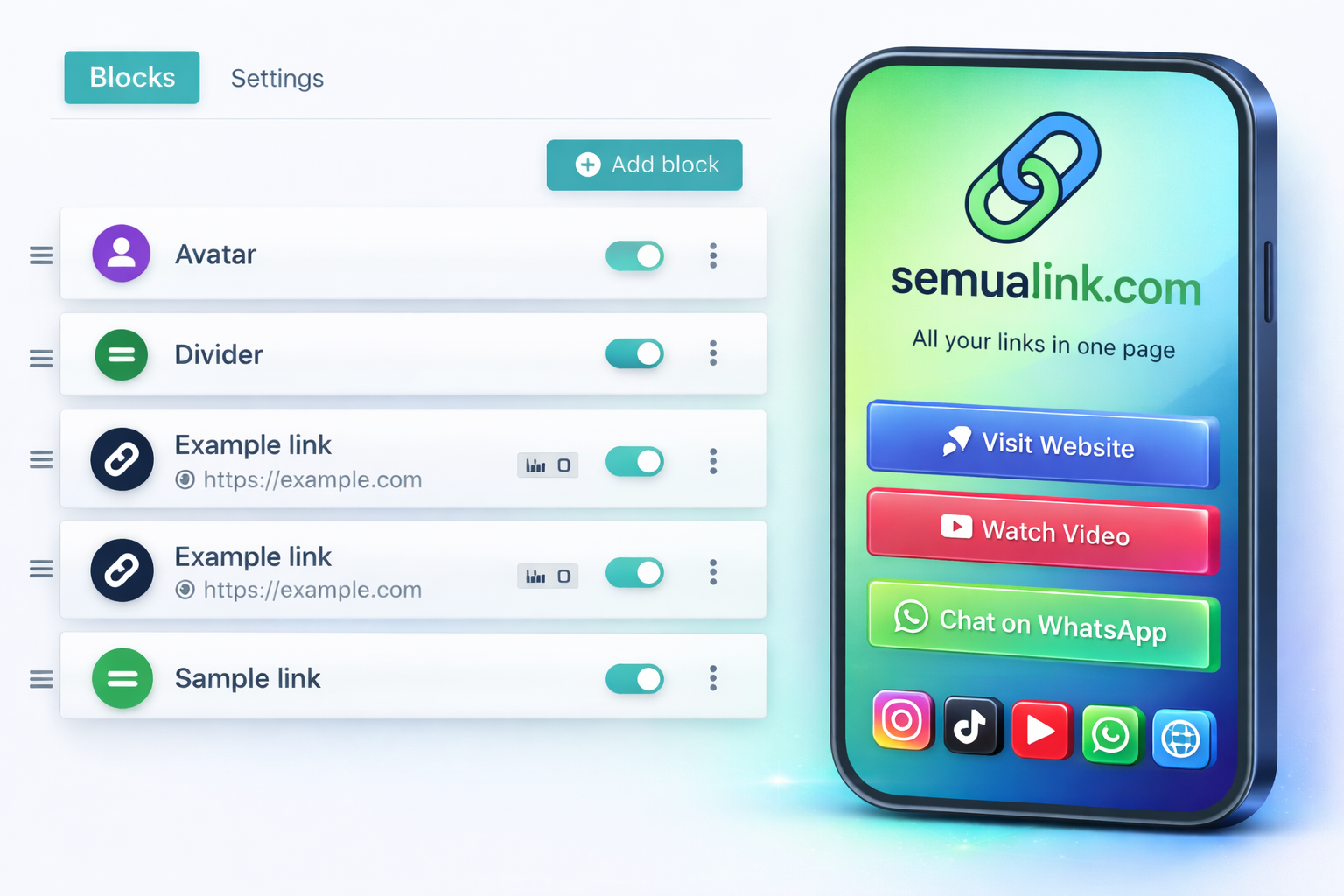 Bangun halaman biolink profesional untuk Instagram, TikTok, YouTube, WhatsApp, toko online, dan website bisnismu — cepat, modern, dan mudah digunakan.